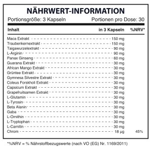 Nahrungsergänzungsmittel auf Basis von Pflanzenextrakten, Aminosäuren und Chrom. Chrom trägt zur Aufrechterhaltung eines normalen Blutzuckerspiegels und zu einem normalen Stoffwechsel der Makronährstoffe bei. Mit Gymnema sylvestre, grünem Tee, Maca, Ginseng, afrikanischer Mango und anderen Pflanzenextrakten, die traditionell zur Gewichtskontrolle und zum Energiestoffwechsel eingesetzt werden.